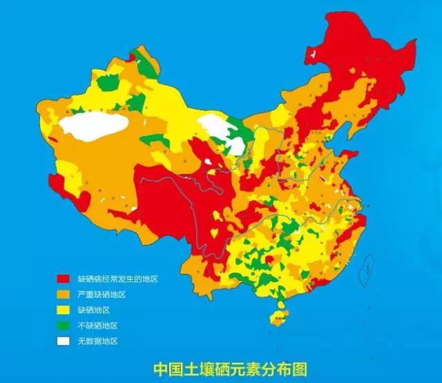 (1)环境缺硒。我国有72%的国土硒含量低于平均水平,其中30%为严重缺硒地区,长期生活在严重缺硒地区的人易患克山病等地方病。