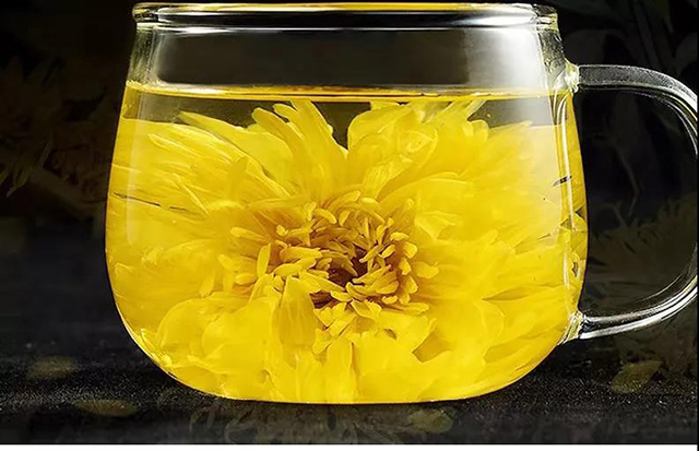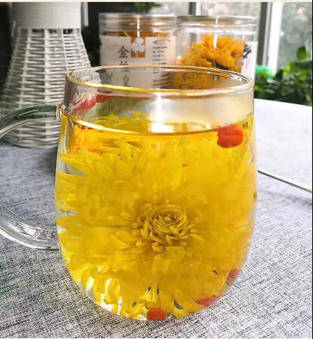 一泡:纯净水浸泡,朵朵金菊在杯中绽放,金黄色花瓣在水中荡漾,令人爱不释手。