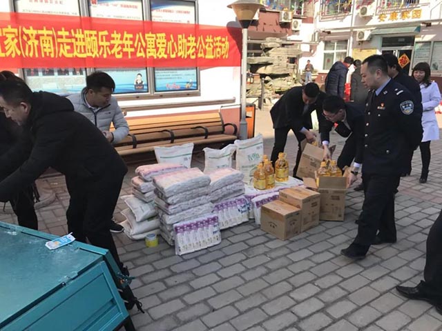2018年2月6日下午, 中宜国粮济南分公司总经理助理王朋涛与泺河派出所史警官一行人来到洛河社区颐乐老年公寓进行慰问捐赠,将孝恩的温暖之风带给这儿的老人们!