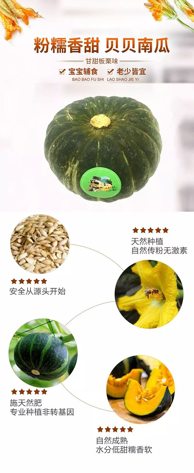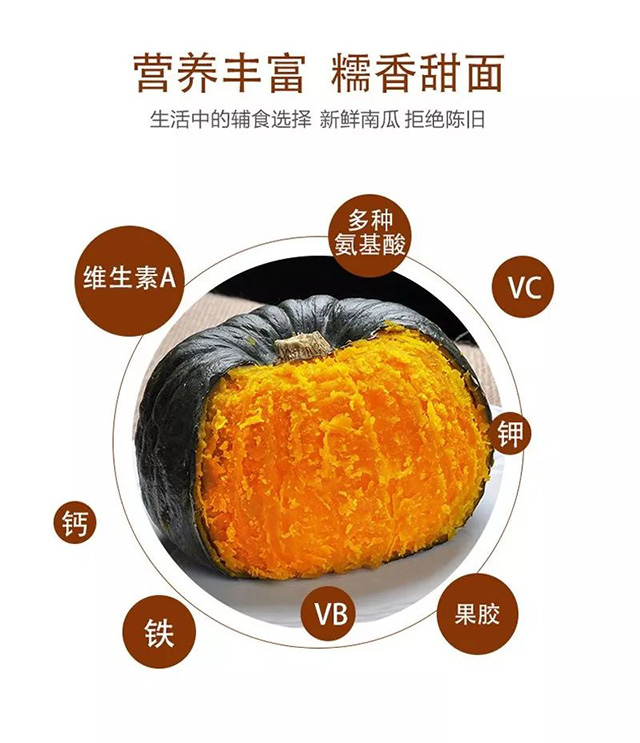 贝贝南瓜营养成分远超国产大南瓜,其中干物质含量极高,非还原糖和淀粉含量高,淀粉与全糖比率大于1,蛋白质高,纤维较少,维生素A、C含量高,是很好的保健食品。南瓜果肉内有一种特殊物质,可促进胰岛素分泌,降低血糖水平,对防治糖尿病有特效。