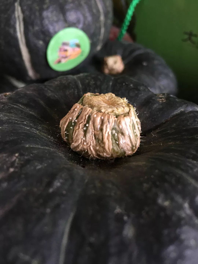 老南瓜的瓜蒂有纵向的自然皴裂,这样的南瓜就是在蔓上老的瓜。嫩瓜即便是放老,瓜蒂只会干瘪但不会有纵向自然皴裂。(如图,明显的纵向裂纹)