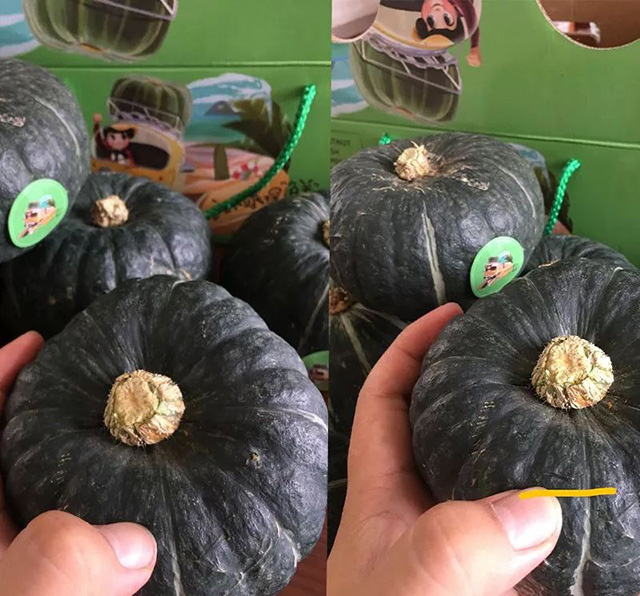 用指甲朝南瓜的外皮稍稍用力一掐,老南瓜外皮比较坚硬紧实。如果南瓜皮一掐就破,就证明成熟度不够,是嫩瓜,很难掐入或无法掐入则证明是老瓜,这样的瓜可放心选购(如图,只掐出印,但无法掐入)