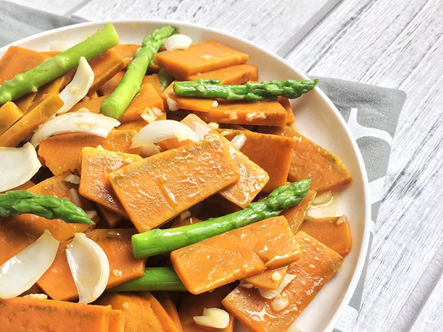 1、百合掰开洗干净,芦笋切段,南瓜去皮去瓤切薄片