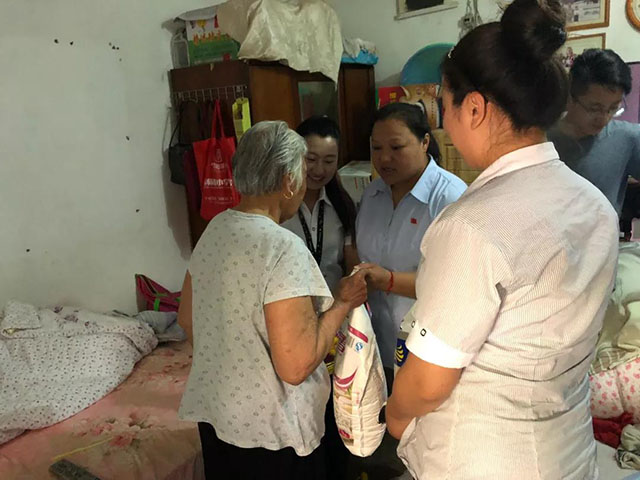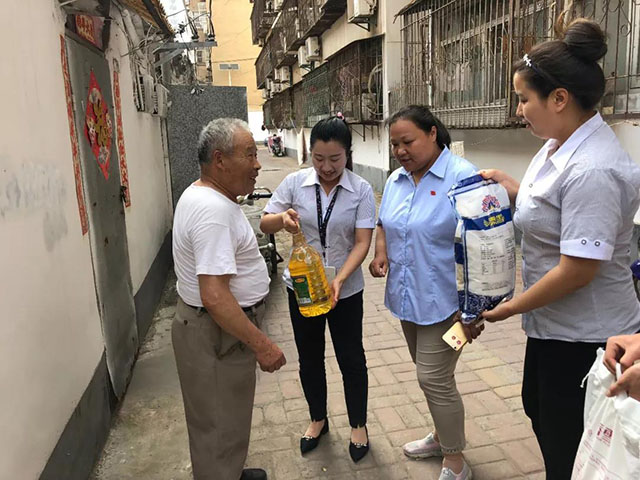 2018年6月15日下午, 中宜国粮徐州分公司总经理吴春岭、部门经理褚杨杨、分部经理董永龙、人事庄伟等一行四人来到徐州市小北门社区,在社区解主任的带领下来到社区走访慰问困难老人,并为他们送上了米、面、油等。社区解主任代表居委会表示对中宜国粮的感谢,希望后续社区与中宜国粮能够有更多的扶贫合作。吴总也对此次活动发表讲话,公司将会加大慰问的力度及广度,也欢迎社区的居民积极参加公司的团购活动,成为中宜国粮的会员。