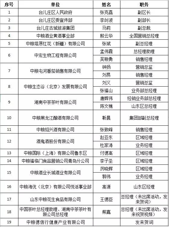 中宜国粮2018年总结表彰大会暨文艺汇演于年会首日举办,大会邀请了中粮各板块领导以及部分台儿庄政商两界重要人物,嘉宾具体名单如下: