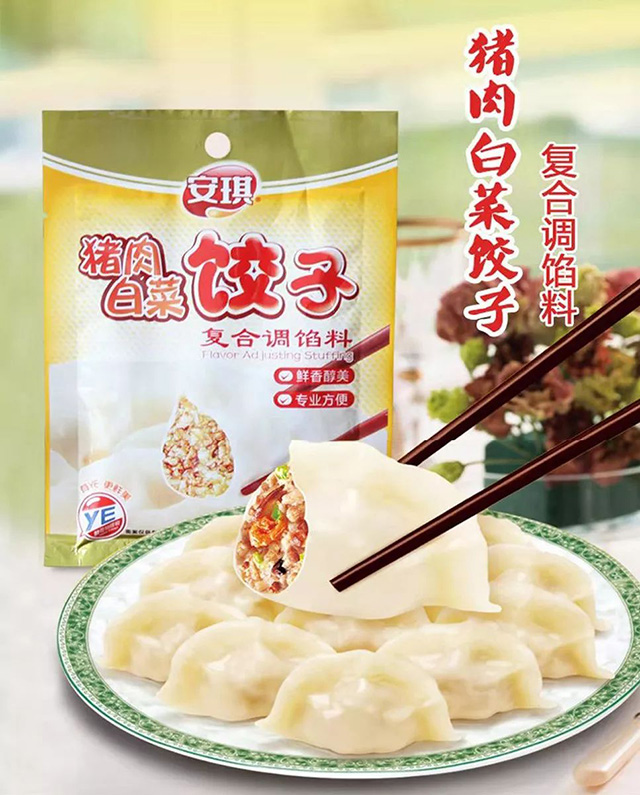 安琪公司新开发的“猪肉白菜饺子”复合调馅料,适用于猪肉白菜馅制作,还可制作羊肉、牛肉等咸鲜味型肉馅,配菜除白菜外,还可选用芹菜、荠菜、茴香苗等素材。