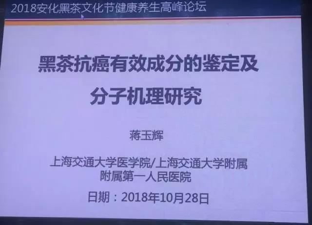 2018中国湖南安化黑茶文化节健康养生论坛~上海交大医学院和附属第一人民医院蒋玉辉博士最新研究成果:黑茶抗癌有效成分鉴定及分子机理研究。