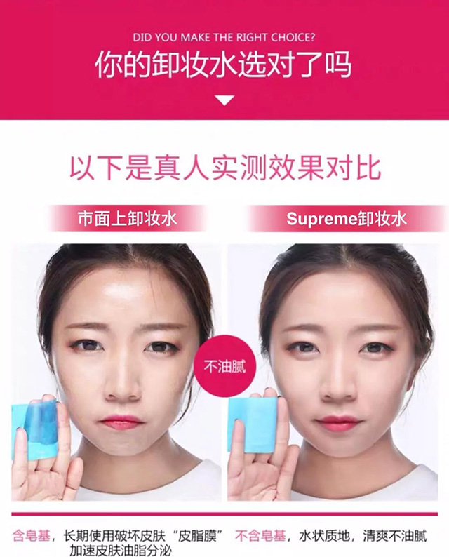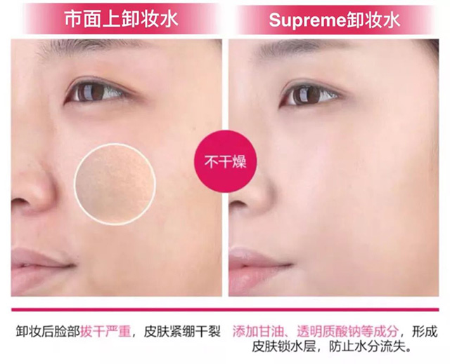 一瓶Supreme卸妆水,集合6大功效:卸妆、清洁、补水、锁水、舒缓、修护;只需一步,轻轻一抹,让肌肤感受最原始的、初生时的清澈和透爽,免洗快速,懒人的福音。