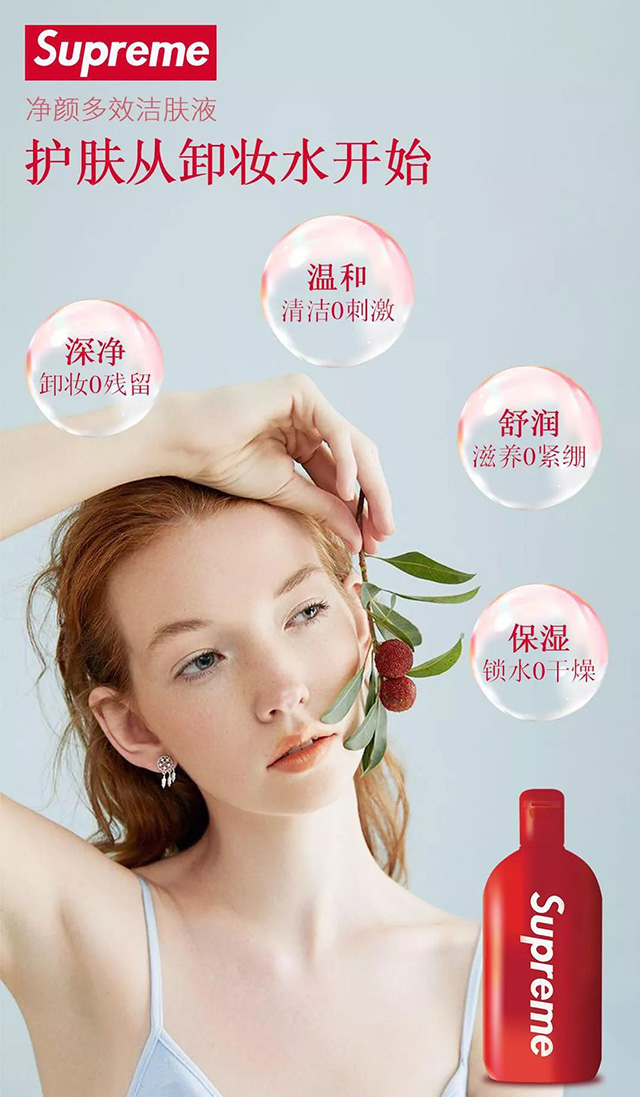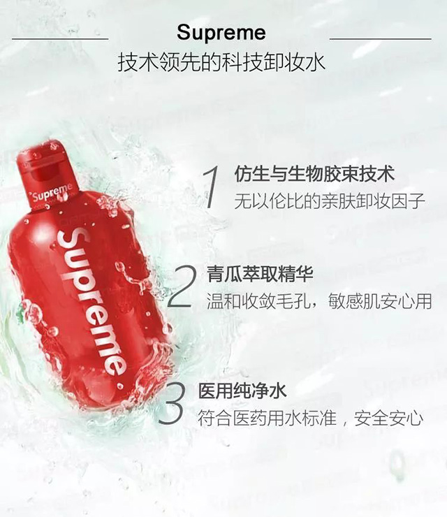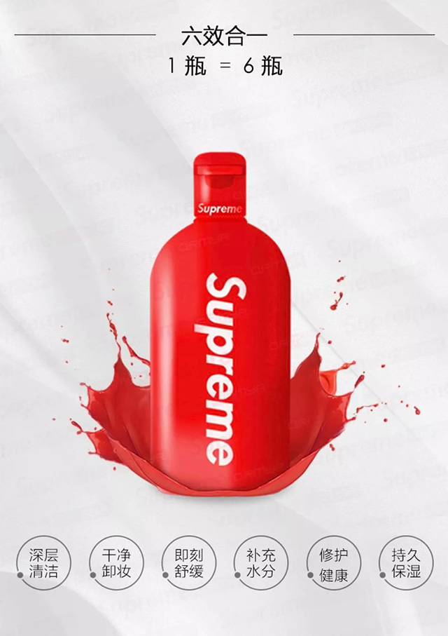 美国潮牌supreme首次触电化妆品,用汹涌的潮牌力量促动潮流与科技的完美结合,更火更爆更实用!!!小红书已经爆火了,1000+个网红、10000+篇笔记力荐,潮人必备!一瓶多效,一瓶就够了!卸妆、清洁、补水、锁水、舒缓、修护。