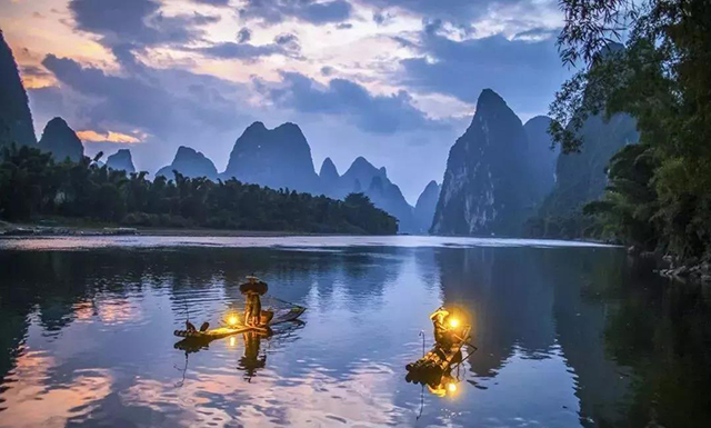 五月,桂林刚刚开始进入丰水期,乘着竹筏,飘荡在漓江之上,听渔舟唱晚,赏落日夕阳,着实是一种精神上的享受。