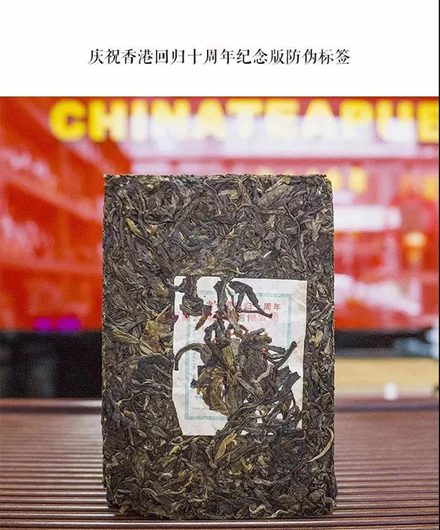 为纪念香港回归10周年,中茶公司于2007年推出“香港回归10周年纪念茶普洱茶系列产品”,并限量生产,以提升该系列产品的品饮价值和收藏投资价值。 此茶可即时饮用,也可长期保存收藏。