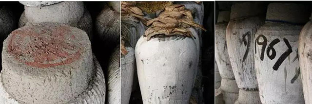 酒入坛后,先用灭菌的干荷叶封口,后用陶制的瓦盖扣住荷叶封口,再用箬壳裹住盖,并以竹丝扎紧,最后才用封泥涂抹密封。封泥是用粘土,谷壳等拌和而成。最后再用石灰满坛罩刷一遍。更讲究的还在封头里压进酒坊的坊单,也就是如今的说明书了。