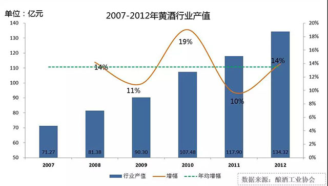 2007-2012年黄酒行业收入符合成长率约13.5%。增长得益于宏观经济增长,绍兴黄酒外扩努力,新派黄酒营销发力等因素。