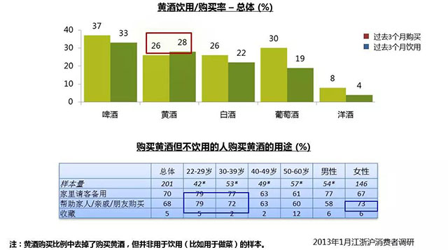 消费者过去3个月的黄酒购买比例为28%,饮用比例为26%,在测试的五类酒精产品中国普及率仅次于啤酒,领先于白酒、葡萄酒和洋酒。黄酒购买率比例略高于饮用比例,原因是部分消费者,特别是22-39岁的年轻消费者是为家人和朋友购买。