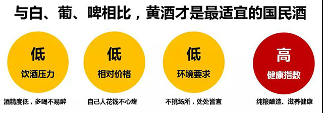 黄酒特点:低度、爽口、价格适中、适宜任何场所饮用,加冰、温饮及加辅饮(红茶)均可。与白酒相比,饮酒压力小,低粮耗,食品安全有保障;与葡萄酒相比,性价比高,岁场所,场合要求低;与啤酒比,消费季长,饮食搭配无顾忌。