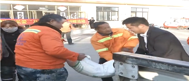 一行人在中宜国粮烟台招远分公司总经理姜晓林的带领下,将价值万余元的大米、面粉送到环卫工人的手中,为他们送去温暖和祝福,感谢他们为市容整洁作出的贡献,用实际行动呼吁社会各界人士关爱环卫工人。